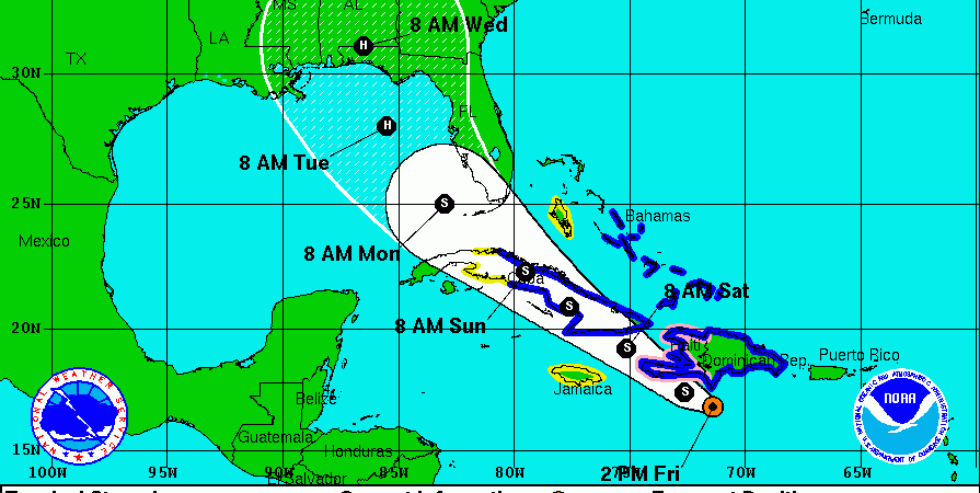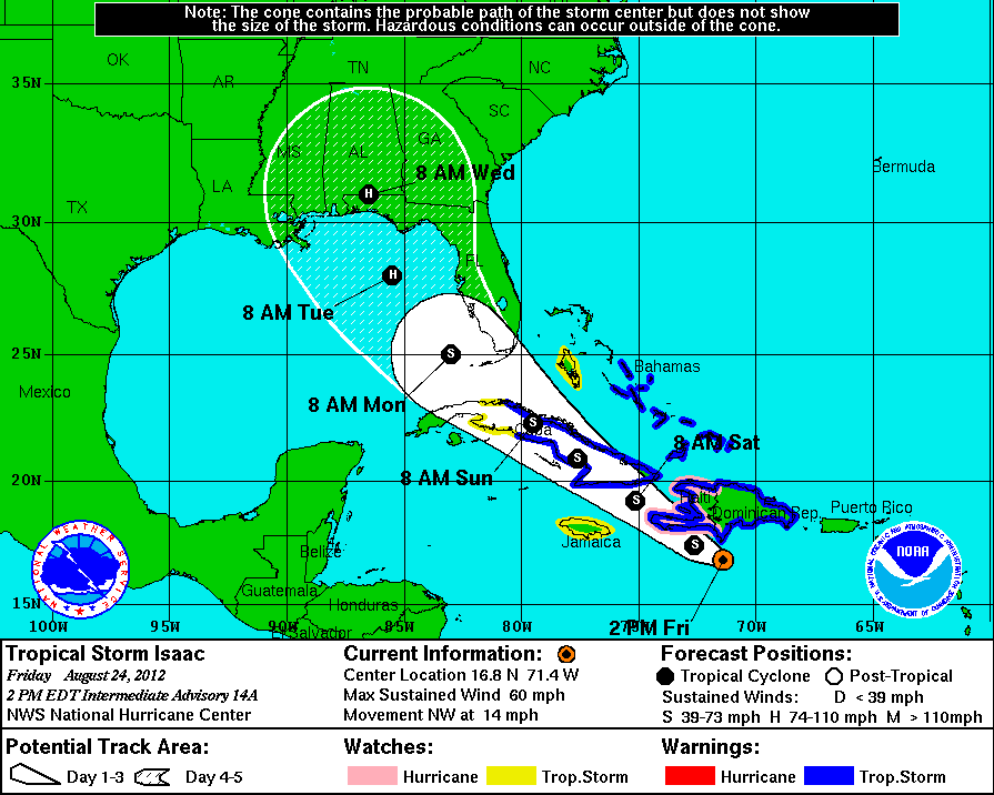 Tropical storm Isaac is heading towards the Gulf of Mexico, meteorologists said. The report from the National Hurricane Center Friday morning was that the storm is expected to pass through Haiti and Cuba Saturday and make landfall in the U.S. Monday. Rain and winds from the storm have already begun to pound the Lesser Antilles islands near Puerto Rico, according to the NHC. The storm is expected to become a category one hurricane before it hits the U.S. and will likely make landfall near Tampa, Fla. Rain and storms may reach as far as southern Louisiana, however.