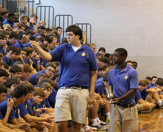 Student Council President Connor Mahony and Vice President Justin Elzy bless the SPS student body with holy water in the gym at the first assembly of the 2012-2013 school year to initiate a great and spiritual year. This annual ceremony keeps students optimistic and excited about the year to come.