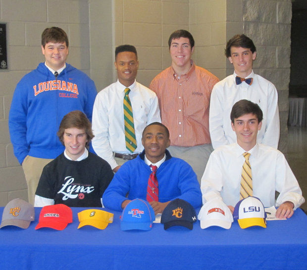 (Top) Tanner Steward, Mitch Brumfield, Andre Marshall, and Zachary Albright and (Bottom) John Frey, Marcus Gaines, and Don Lipani display their new colors after the signing ceremony. (photo by Karen Hebert)