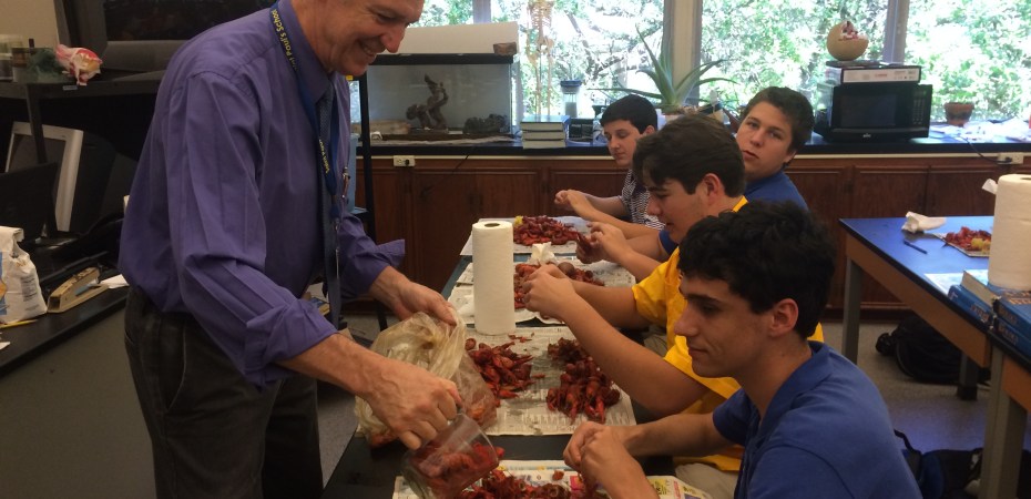 (COVINGTON, La.) — On Tuesday, April 21, 2015, John Carambat’s sophomore level Biology class treated themselves to mounds of crawfish during Period F to aid in the study of invertebrates.