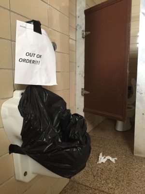 A dysfunctional urinal, which has been “out of order” for months, is hastily covered with a trash bag as it sits dormant in the boys’ restroom on the first floor of Benilde Hall. Many students avoid using the Benilde Hall restrooms if possible. (Photo by Lester Guttuso)
