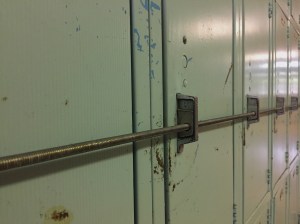 Rows of unused lockers line the hallway of the first floor of Benilde Hall. (Photo by Lester Guttuso)