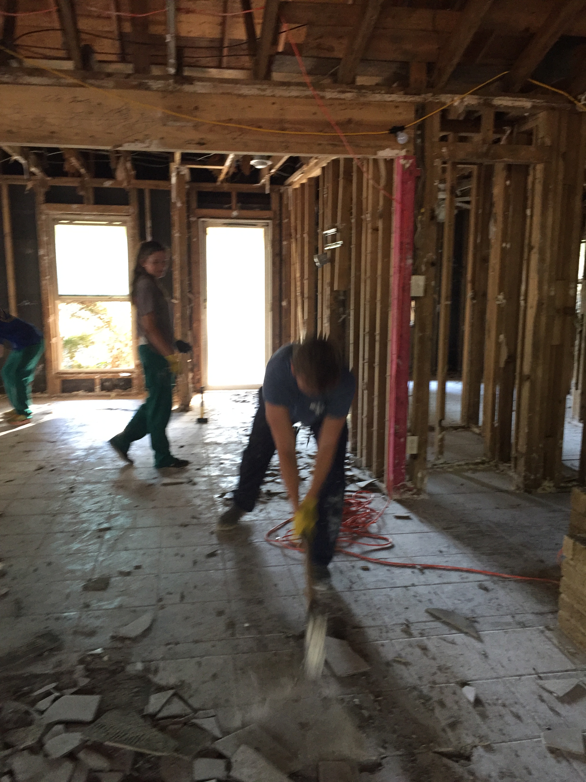 We woke up to cramped necks from sleeping on lumpy air mattresses and crawled our way out of bed to fuel up with coffee and biscuits, a typical Texan breakfast. After our breakfast, it was time to head over to our work sites. Driving down the road, we were flanked by pile after pile of house guts that had been hurriedly ripped out by people trying to meet the deadline of free trash pickup. Our job was to remove tile from two houses, and then go assist in the gutting of another house. Our homeowner was a jolly old man who was ecstatic to have us help him. So ecstatic, in fact, that it was hard to believe a hurricane had inundated his home just a short time before.