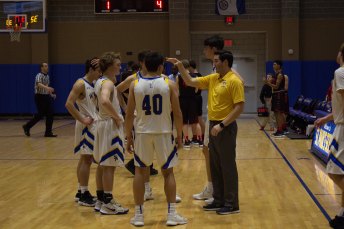 Coach Dale huddles up with the basketball team during a game. (Photo by Joel Fernandez)