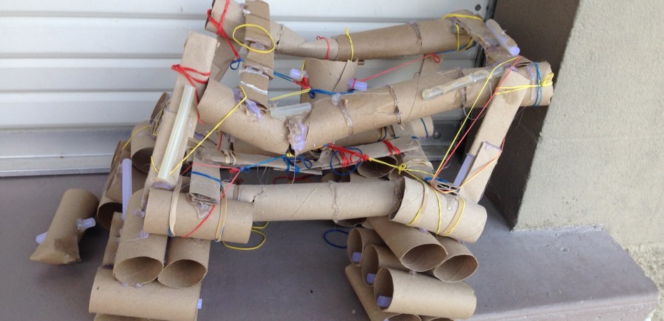 Cambre’s boat-shaped vessel, which survived two out of three drops. (Photo courtesy Mason Cambre)“I spent probably 15 hours building my vessel,” said Mason Cambre, who had the bags under his eyes to prove it. “I hardly got any sleep.” Cambre’s model was a massive, boat-shaped structure held together by toothpicks and rubber bands, with a hull made out of opened toilet paper tubes.