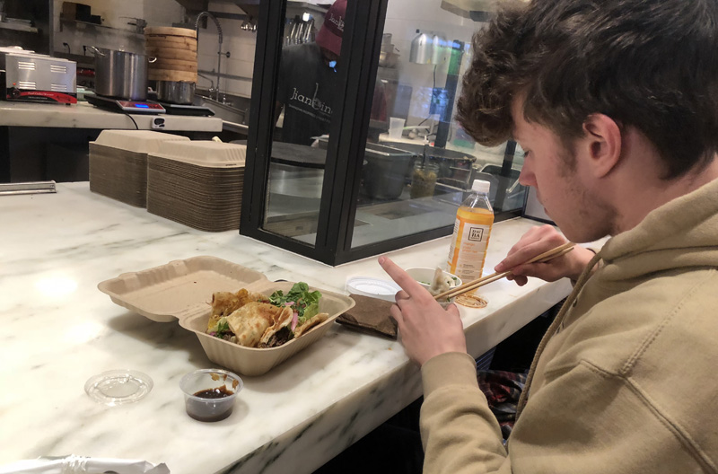 Jianbing Company was easily my favorite place we went to all week. It was located in the Gotham West Market, which was basically a food court on gourmet crack. It was a beautiful building with multiple delicious-looking restaurants serving everything from pizza to ramen bowls to fancy, savory and sweet waffles. Yet, I was sucked into Jianbing Company due to the mesmerizing way they make their food. They classify themselves as Shanghai-inspired street food, something I have never heard before. I ordered something called the Jidan Bing. Similar to a taco, it consists of a flaky, doughy crepe with an excellent crisp to it, which is stuffed with hoisin-lime beef, bacon, romaine lettuce, scallions, cilantro, pickled red onions, an Asian house sauce and chili sauce. Watching them make my meal was making my mouth water. I took a bite out of my flaky, crispy bing and the spicy beef, with a subtle cold crisp from the romaine, lit up my taste buds. The pickled onions with the lime beef made for an excellent tangy combination. Every bite was was better than the last. I was very pleased on ending my trip on a good note with this meal. Rating: 10+ out of 10.
