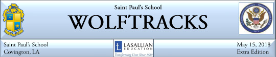 (COVINGTON, La.) This special mid-month edition of the Wolftracks highlights many of the end-of-year events occurring on campus during the month of May, including the Air Force Junior ROTC banquet and the “Stuff the Bus” food drive. The issue also highlights the achievements of the spring school sports teams, including rugby, golf, and the State Runner-Up baseball and lacrosse teams.