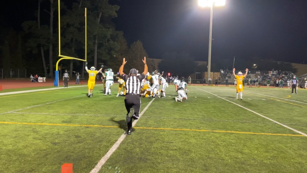Down 14-3 early in the third quarter, the Wolves were in danger of having an even bigger deficit when the Green Waves moved the ball down inside the Wolves’ ten yard line. But the Wolves’ defense held the Green Waves to a field goal attempt. The kick was blocked, sparking the Wolves to go down the field and make the score 14-10 off of a Brody Reina receiving touchdown.