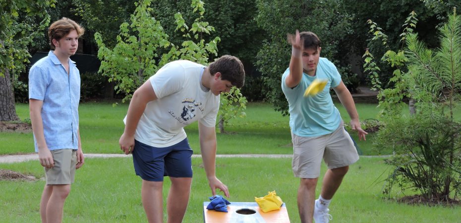 Seniors from left to right: Cooper Estrade, Jacob Tomba, Zachary Gros play a friendly game of corn hole at the senior barbecue