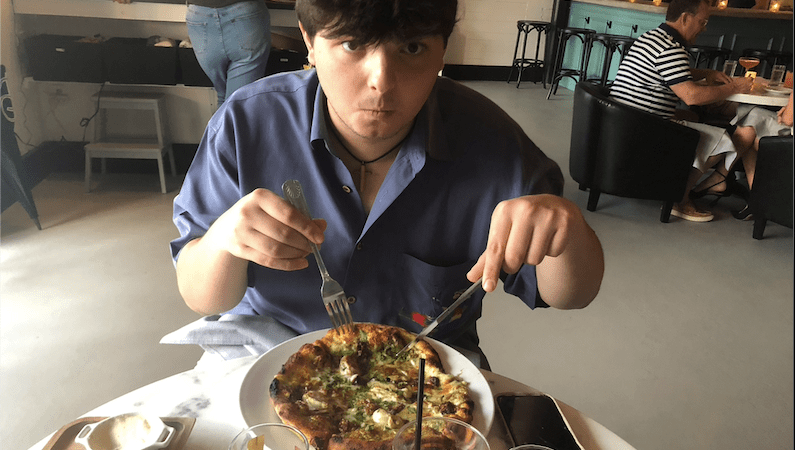 Mason Schwall enjoying his Oyster Rockefeller Pizza