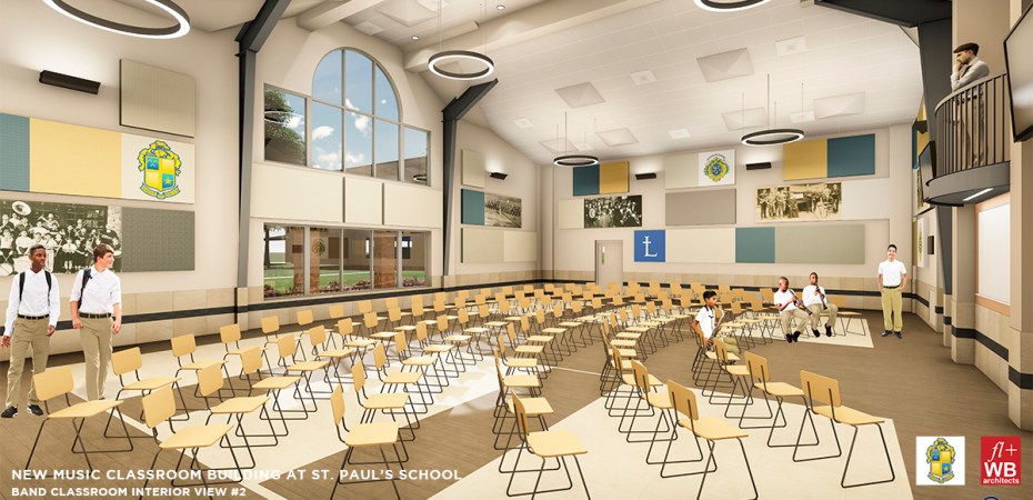 If you have walked or driven around Saint Paul’s recently, you probably have noticed the new band hall. The 2.3 million dollar band hall is the most state of the art building on campus. The building was specifically designed for the 100 piece band. The original band hall wasn’t a hall at all; it was at the top of Benilde Hall then moved into the Recreation Hall, a one-story building. The building was a barbershop, infirmary, and arcade/hangout for the Saint Paul’s boarding students, and that building has housed the Marching Wolves for over 40 years.