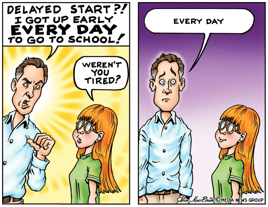 This is because melatonin is released later at night, making early sleep almost impossible, biologically; thus, asking a teen to wake up at 6 a.m. is like asking an adult to wake up at 4 a.m.