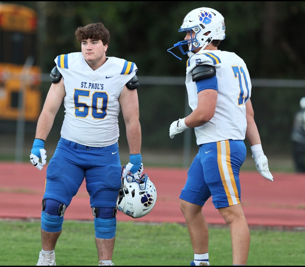 Saint Paul’s offensive lineman and team captain, senior Nate Canizaro, knows what the offense needs to do to secure the district. “As a team, we’re starting to come together really well, but I can only speak for the offense by saying we need to come out to play with our fists out, ready to fight, and we will do great things,” exclaimed a fired-up Canizaro after the game.